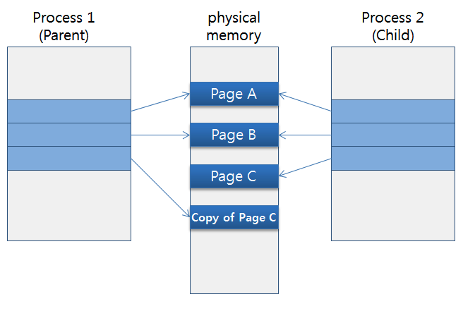 복제된 프로세스를 자식 프로세스라고 하는데 자식 프로세스는 기본적으로 부모 프로세스의 메모리 공간을 공유하게 됩니다. 그런데 자식 프로세스가 생성된 시점에 부모 프로세스에 변경이 생기면 자식 프로세스와 공간을 공유할 수 없게 됩니다. 그래서 부모 프로세스는 공유할 수 없는 데이터를 메모리의 다른 공간에 복사하고 이를 수정하게 됩니다. 이것을 Copy on Write 라고 합니다.